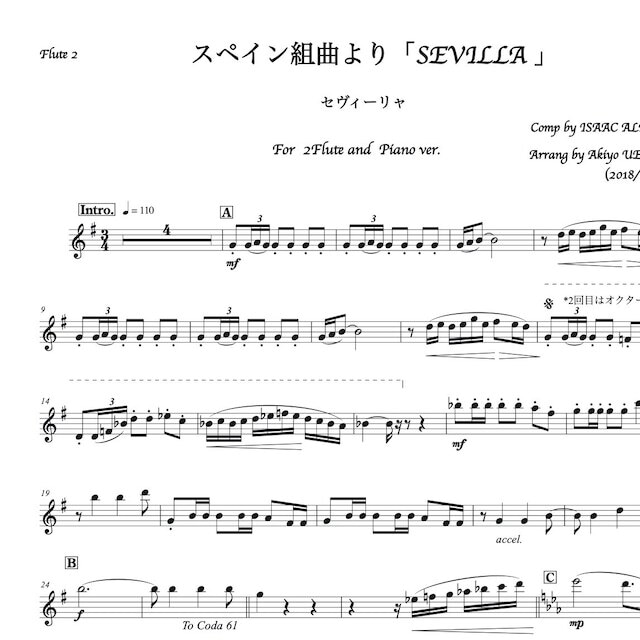 (ダウンロード楽譜)「スペイン組曲より『セビーリャ』」フルート二重奏とピアノ編成